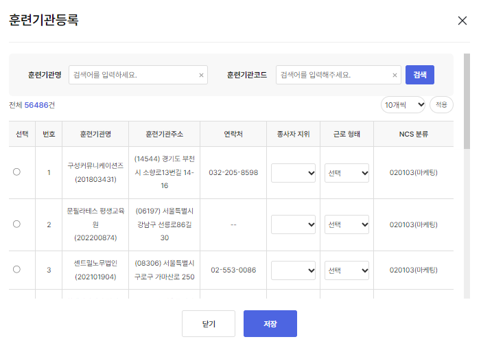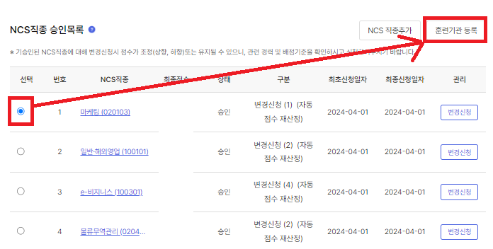 4.NCS직종 승인목록의 직종을 선택 후 훈련기관을 등록해요.