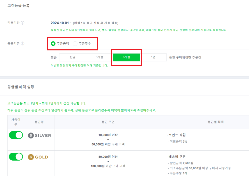 등급 조건에 주문금액은 1만원 이상 되어야 합니다. 여러 등급을 함께 운영하는 경우 등급 조건은 높아져야 합니다.