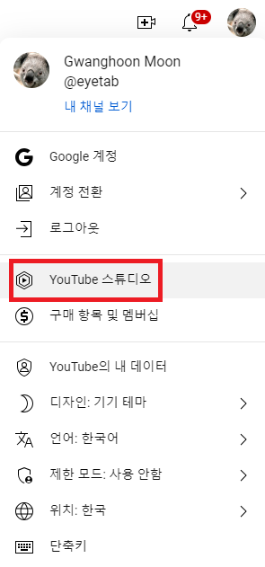 6.오른쪽 상단 동그라미를 누르면 유튜브 스튜디오가 나와요.