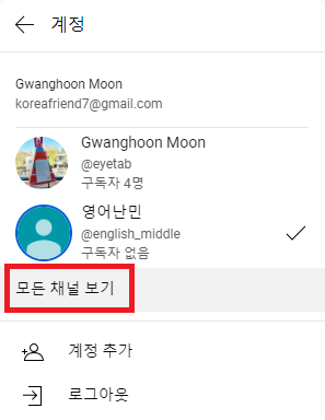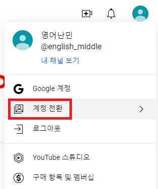 1.유튜브 오른쪽 상단 동그라미를 누르면 계정전환을 클릭해요.
