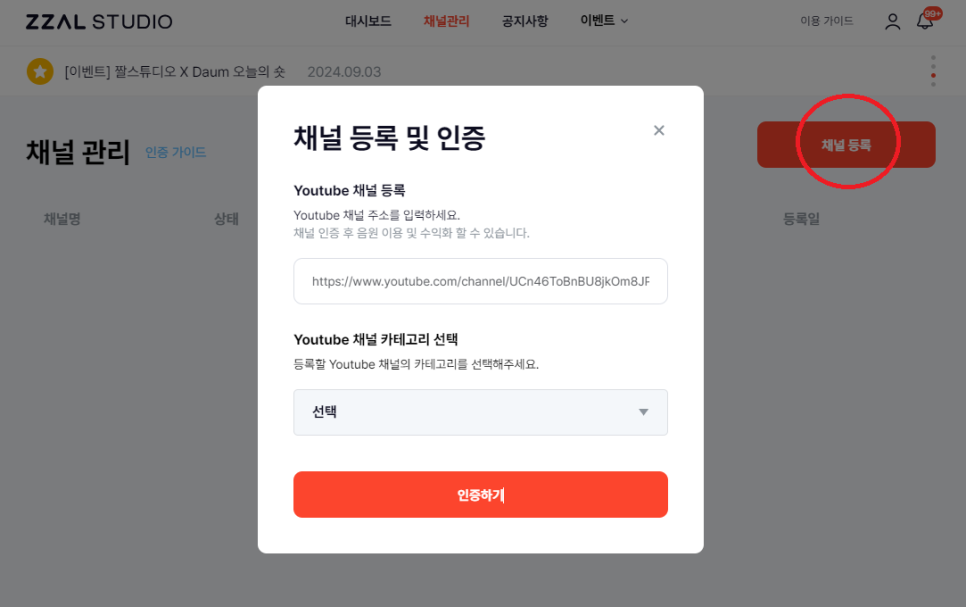 11.채널 등록 및 인증이 되었다는 배너창이 떠요.