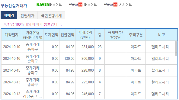 헬리오시티 2024년 11월 현재 아파트 실거래 매매가 표 입니다.