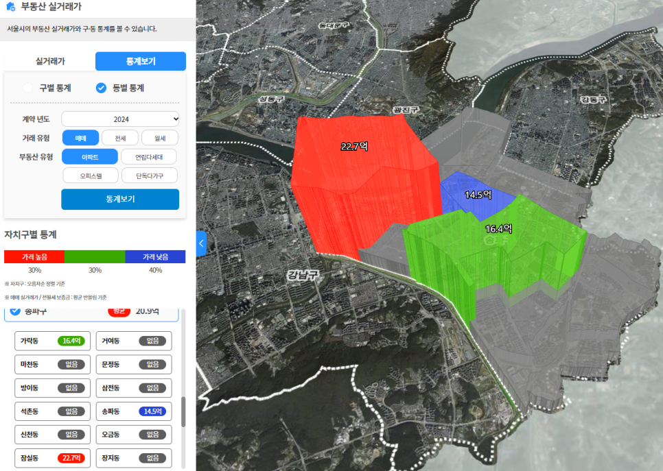 평균 매매가가 가장 높은 동네는 잠실동이며 22.7억 입니다. 가락동 16.4억, 송파동 14.5억 입니다.