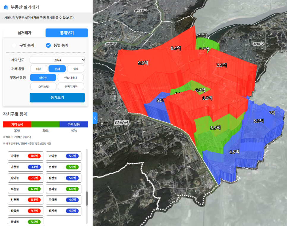 각 동별로 보면 전세가 평균 신천동 8.4억, 가락동 8억, 문정동 5.9억, 방이동 7.5억, 가장 낮은곳은 마천동 3.4억 입니다.
